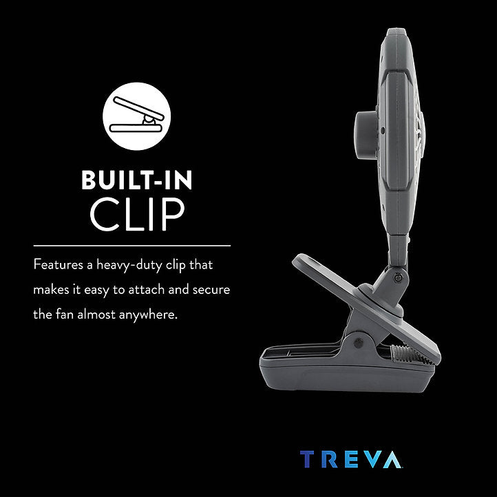 The TREVA 5" CLIP FAN is perfect for indoor or outdoor cooling needs. For use on picnic tables, ladders, golf carts, beach chairs, in the car, on headboards, strollers and more! The heavy-duty clip allows you to attach fan to any stable surface up to 1.5” thick. Fan head rotates and pivots to direct airflow anywhere you needed it. Compact, lightweight design make it great for travel and easy to store.