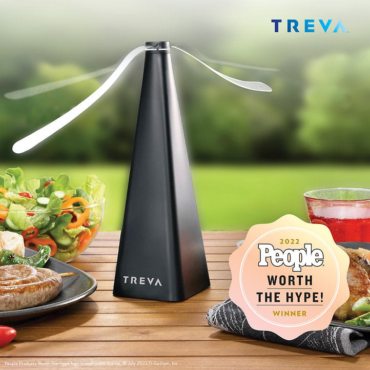 The TREVA Bug Fan is an environmentally friendly, chemical-free way to keep bugs away! No more toxic, smelly sprays, sticky flypaper and citronella candles. Insects are repelled by the reflective pattern on our holographic blades. Blades bend the light (refraction) while spinning, creating an unnatural environment that insects fly away from. Soft-stop, high-quality fan blades are designed to immediately stop when they contact an object.Â